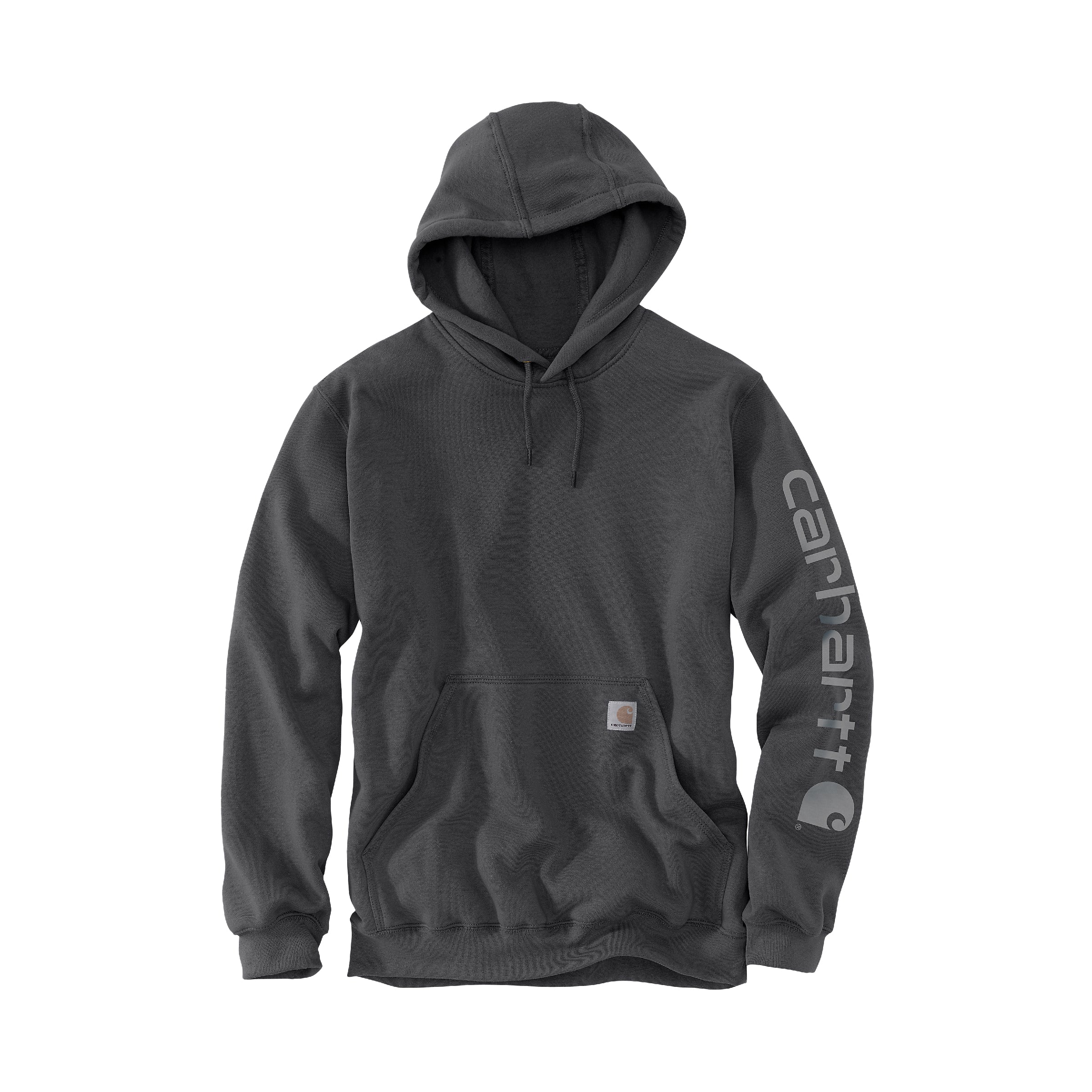 Yksityiskohdat kruunaavat kokonaisuuden: Carharttin ikoninen logo on painettu vasempaan hihaan ja Carhartt-merkki on ommeltu etutaskuun.