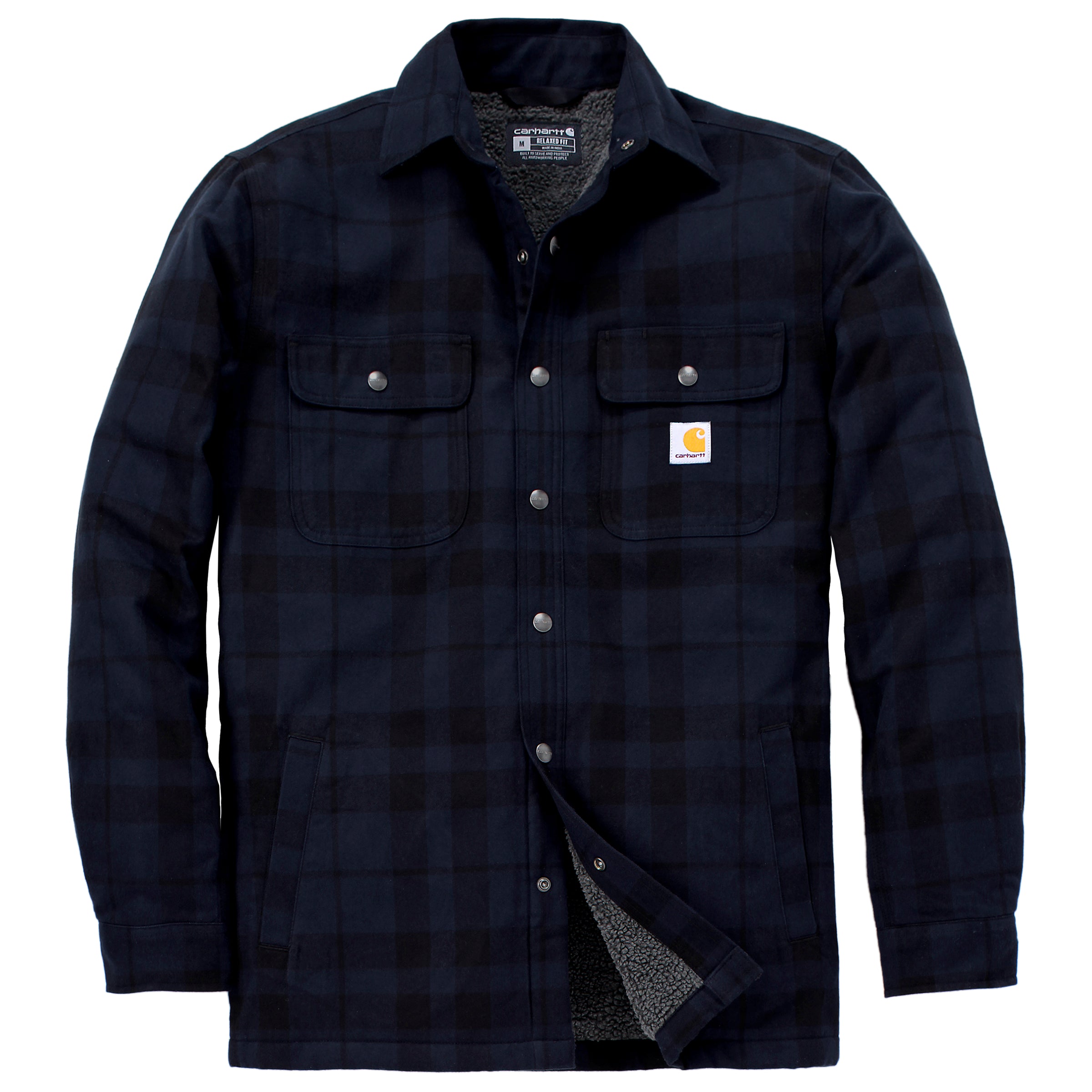 Carharttin Sherpa Lined paitatakki on yksi suosituimmista tuotteistamme, jota käyttävät niin miehet kuin naisetkin. Sen pintamateriaali on pehmeää flanellia ja sisävuori pörröistä teddykangasta. Takki sopii hyvin kerrospukeutumiseen: käytä sitä lämpimillä keleillä t-paidan päällä tai kerrosta viileänä päivänä alle t-paidan lisäksi vaikkapa kauluspaita tai collegepusero.