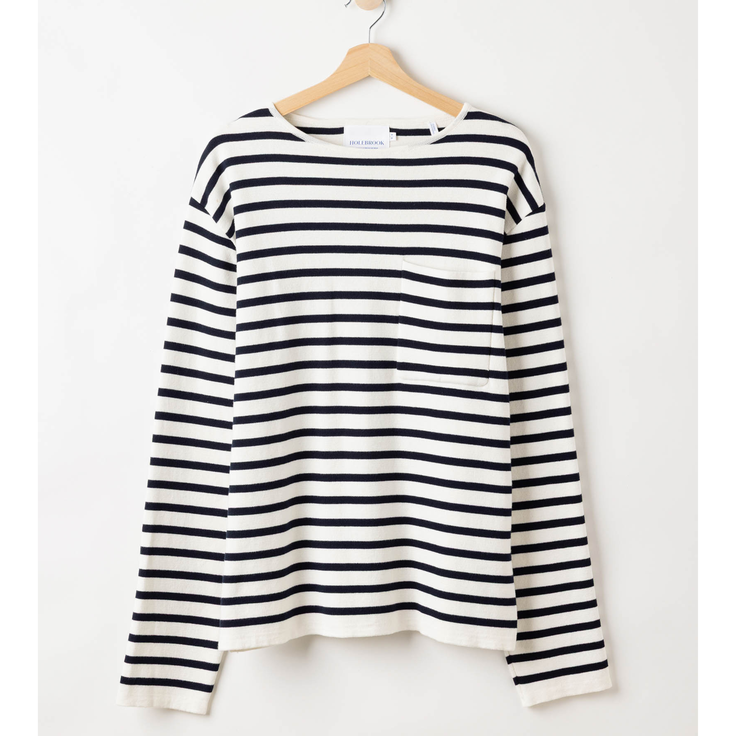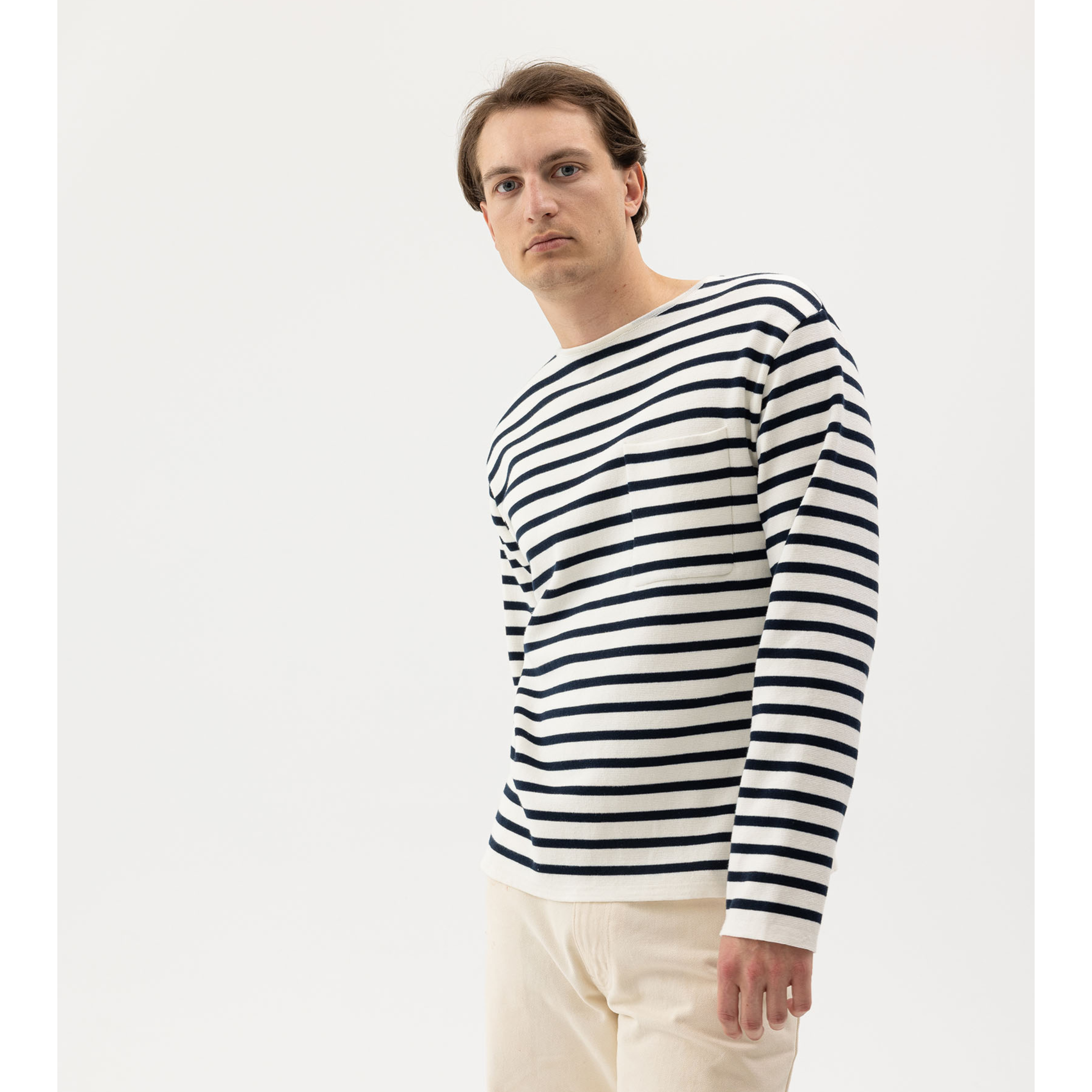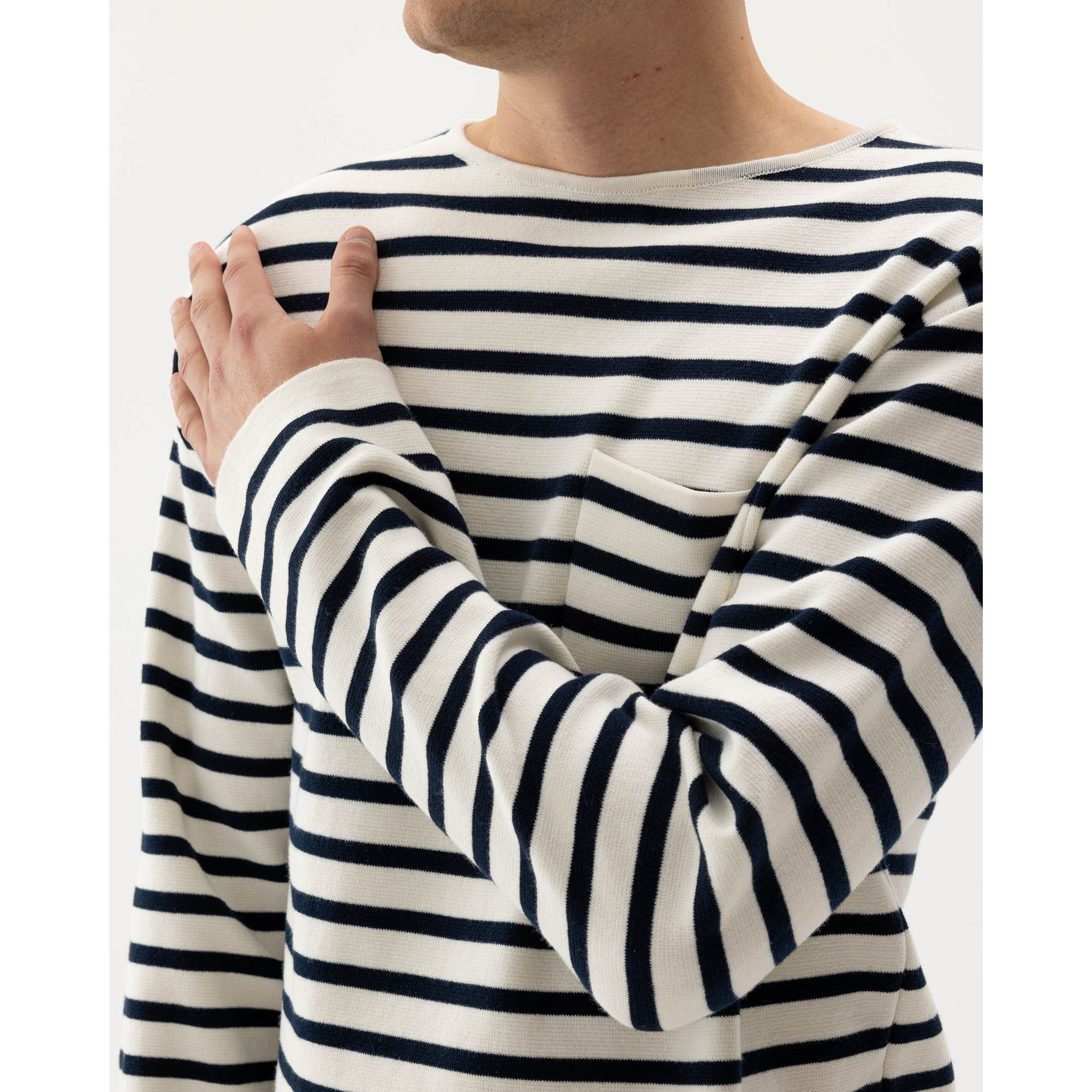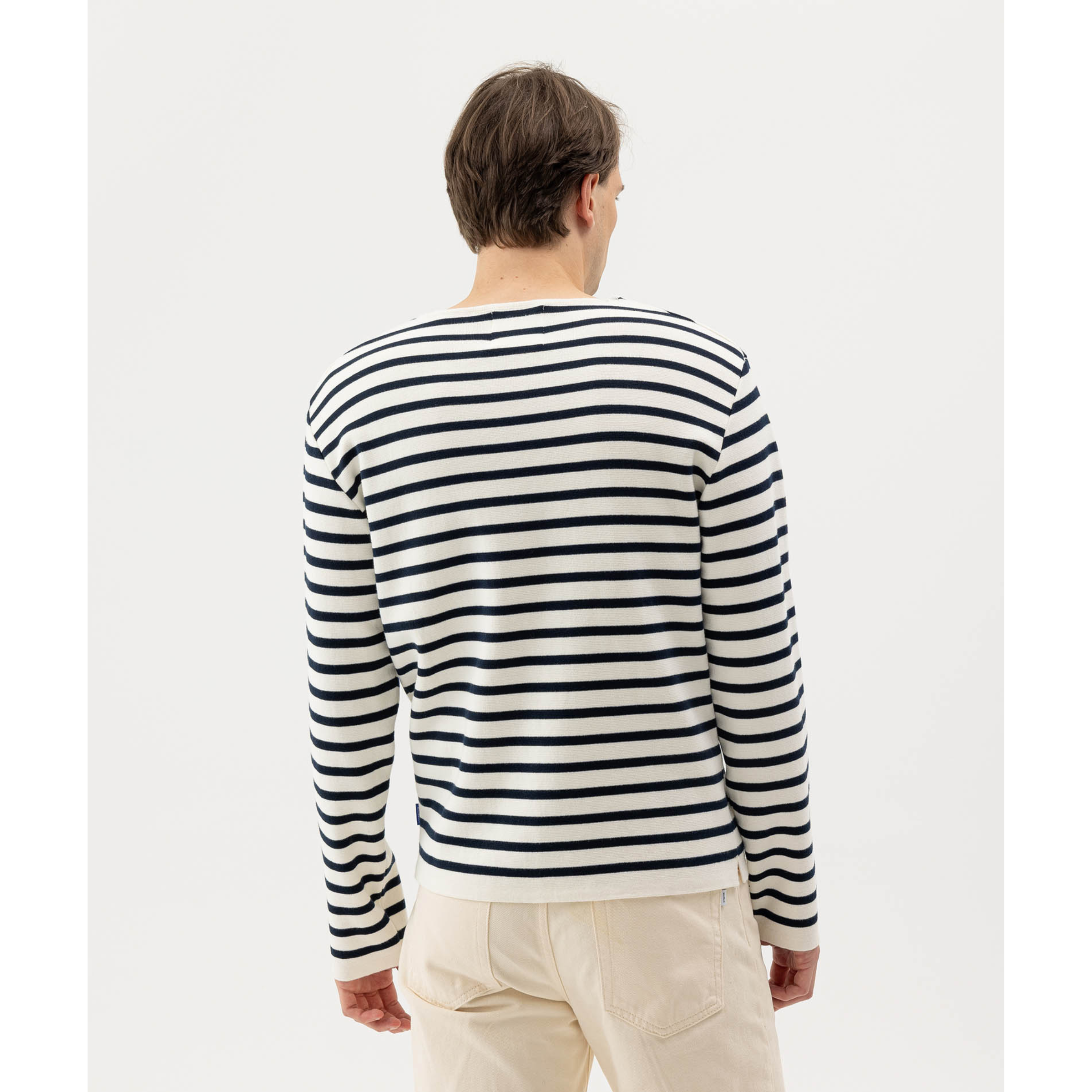 Merihenkisen neuleen pohjaväri on off white ja raidat navysiniset. Edessä rinnan kohdalla on tasku.