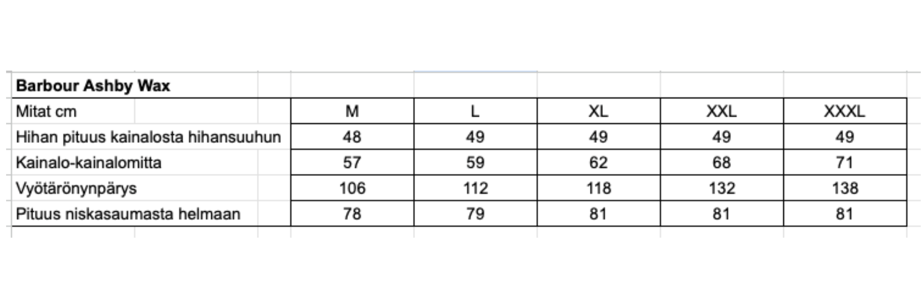 Koska takin leikkaus on perinteistä Barbour Classic Beaufortia kapeampi, suosittelemme valitsemaan normaalia kokoasi yhtä suuremman koon. Tarkista tuotteen mitat kuvissa olevasta kokotaulukosta.