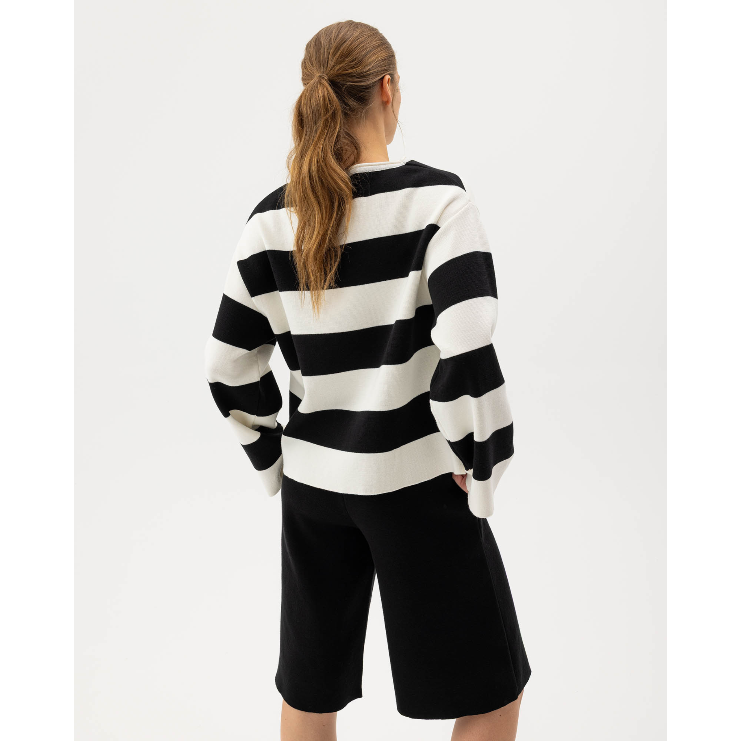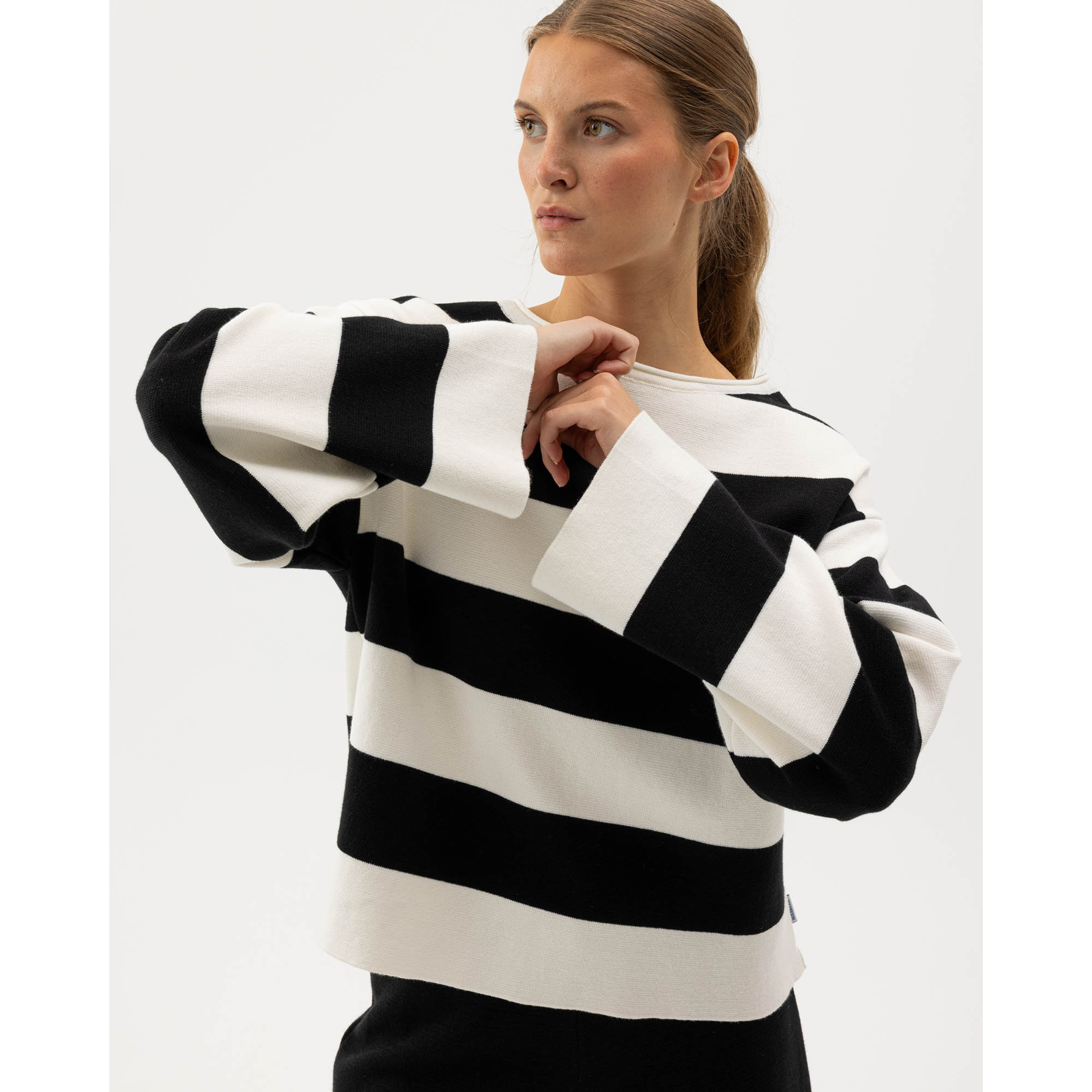 Neuleessa on avara pääntie sekä väljät hihansuut. Malliltaan neule on kevyesti muotoiltu, mutta kuitenkin väljästi istuva. Merihenkistä ilmettä neulepuseroon tuovat paksut mustavalkoiset raidat.