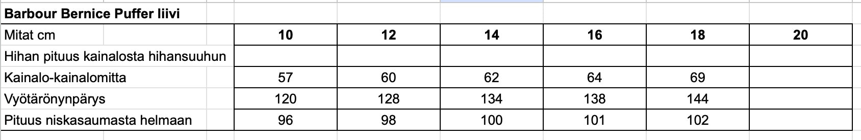Barbour Bernice Puffer Gilet naisten toppaliivi yhdistää monikäyttöisyyden ja käytännöllisyyden klassiseen Barbour-tyyliin. Pitkä, tikattu toppaliivi lämmittää niin ulkoillessa, kaupungilla tai vaikka lasten harrastuskenttien laidoilla. Pitkä toppaliivi sopii täydellisesti yhdistettäväksi esimerkiksi t-paitojen ja neuleiden kanssa. Kylmällä säällä voit laittaa sen vaikka lisälämmöksi Barbourin takkien alle.
