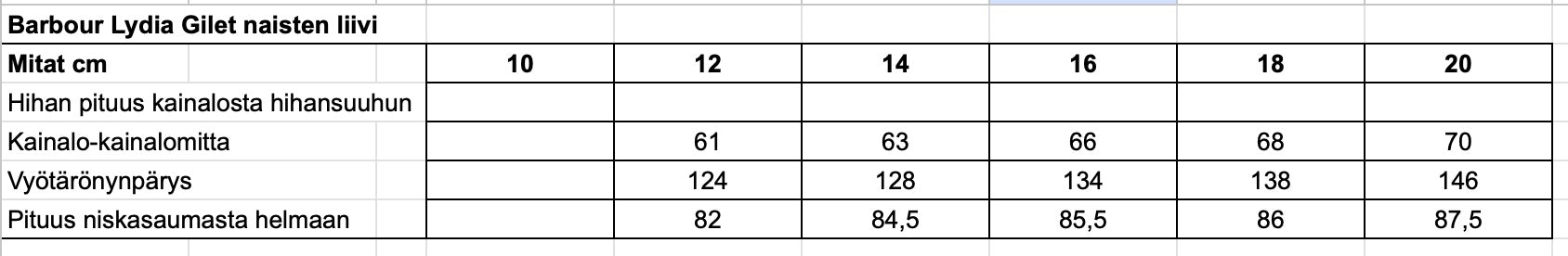 BarbourinLydia Gilet on käytännöllinen ja tyylikäs valinta viileneviin päiviin. Midimittainen liivi sopii täydellisesti kerrospukeutumiseen – käytä t-paidan tai collegepaidan päällä syksyn arjessa tai kevyen takin alla lisälämmikkeenä kylmemmillä keleillä. Liivi sopii hyvin myös toimistokäyttöön esimerkiksi valkoisen kauluspaidan kanssa.